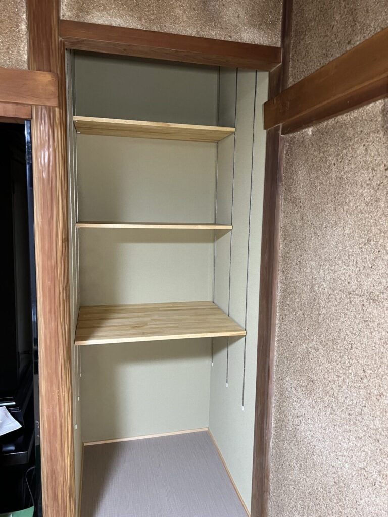 可動棚3段、棚レールを6本にすることで段ごとに奥行を変えられる仕様にしました。