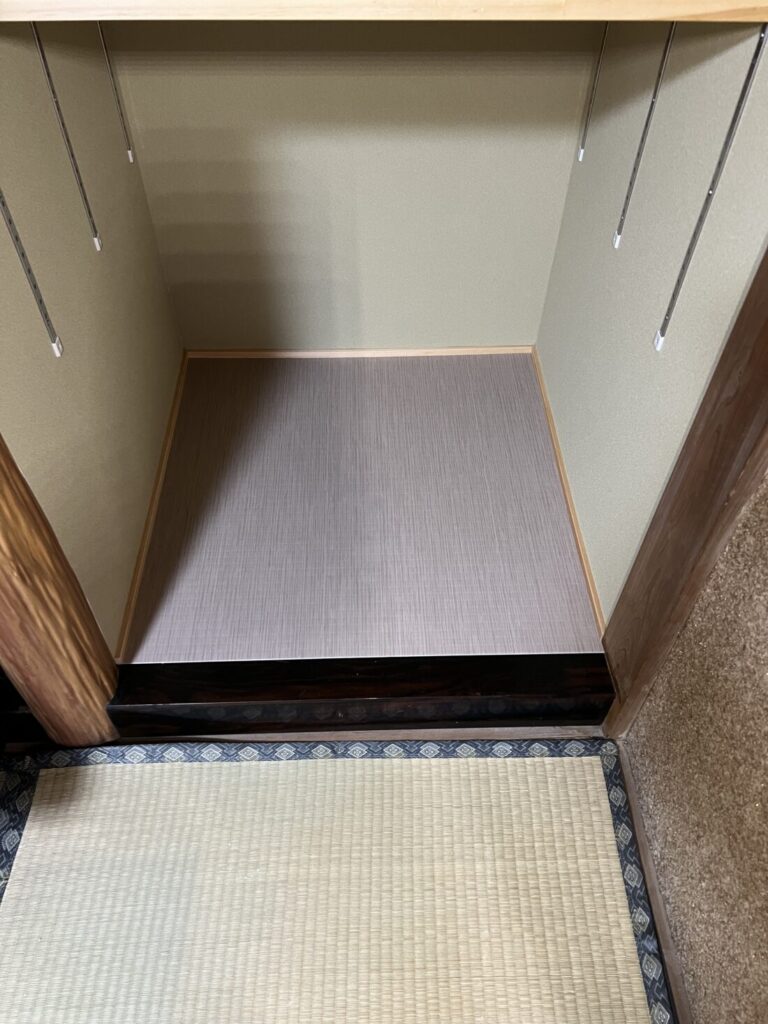 繊維壁→合板+クロス貼仕上、床面は畳調フロアタイル900角1枚貼り仕上